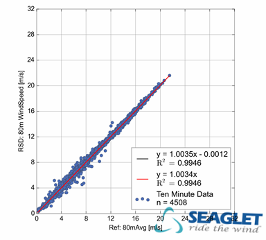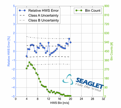 (Good comparison of horizontal wind speed measurements at 80m, e.g. passes criteria requiring R2 and Slope within 2% of unity. Relative error shows no obvious wind speed dependence.)
