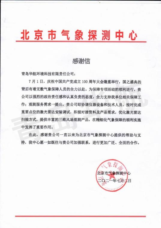 2021年7月1日,我公司测风激光雷达参与中国共产党建党100周年庆典活动气象服务保障工作,实时监测活动现场三维精细化低空风场信息,为当天临近天气预报信息更新、保障飞行编队低空飞行安全提供了有力数据依据,雷达的服务和保障效果受到用户一致好评。